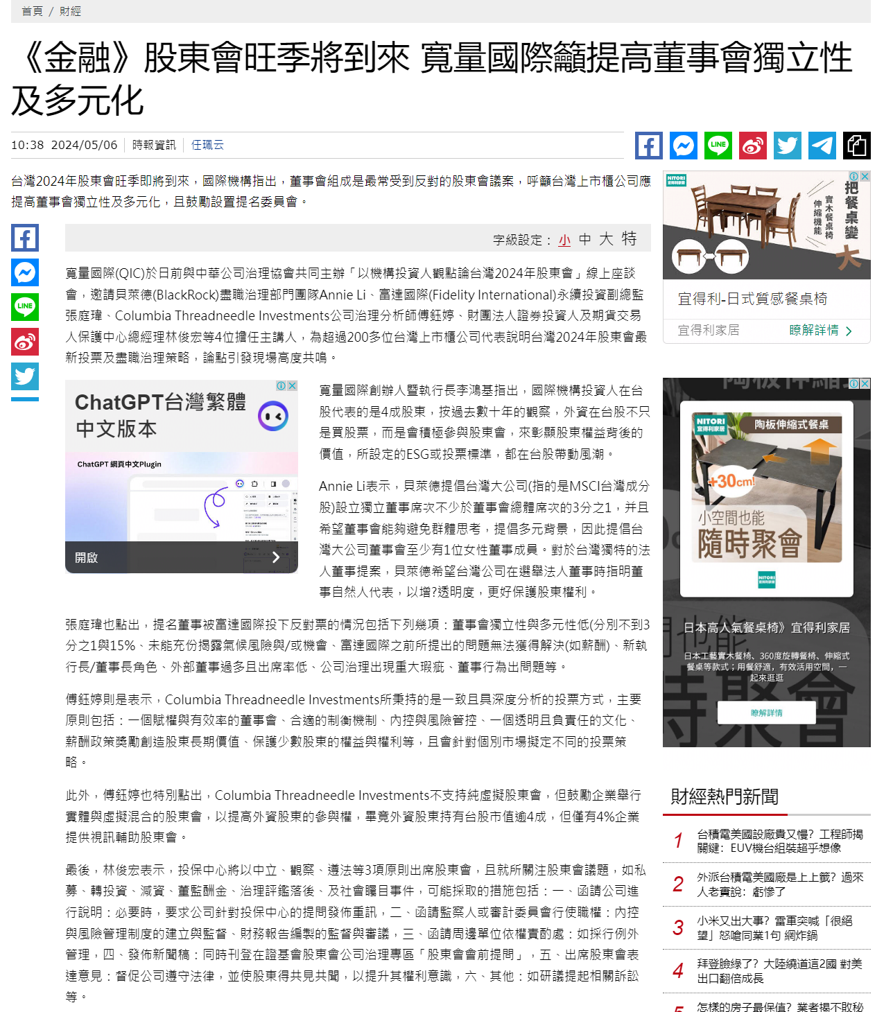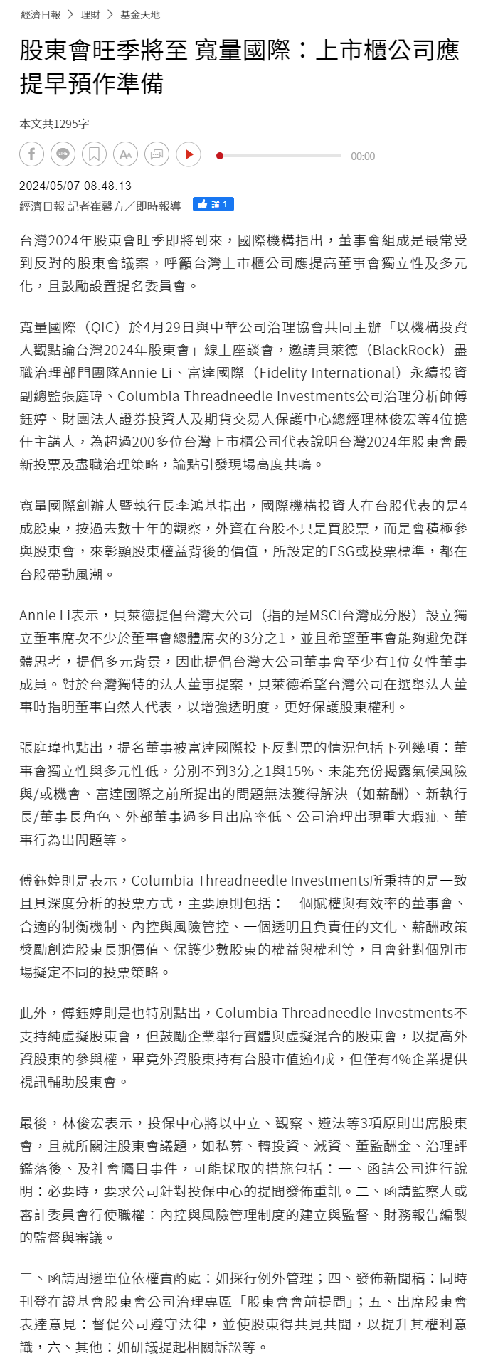本中心林總經理俊宏受邀參加113年4月29日寬量國際(QIC)與中華公司治理協會共同主辦之『以機構投資人觀點論台灣2024年股東會』線上座談會,分享本中心出席股東會之實務經驗。
